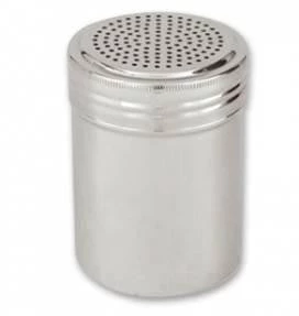 Stainless Steel Cocoa Shaker. Features a coarse stainless steel screw on top.