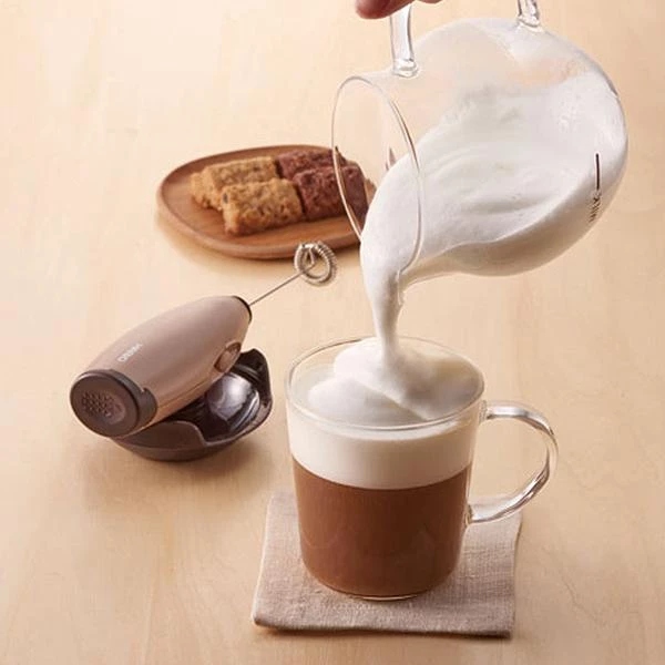 The Hario “Qto” Creamer is the perfect hand-held milk frother for your morning coffee. The set includes a brown, battery-operated milk frother and a glass server (100ml capacity). The frother and server are held together by a plastic lid which clips onto the server to keep the unit stable.