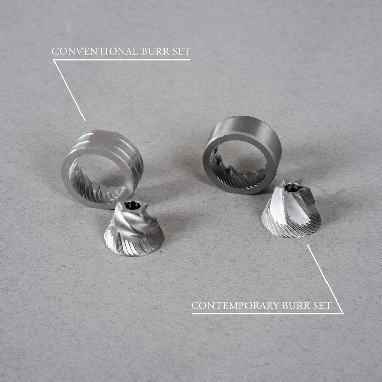 The conventional and contemporary burrs are comparable. Both are great at grinding all kinds of coffee from finest Turkish coffee to coarse French Press Plunger. They produce different results depending on the brewing method you use.