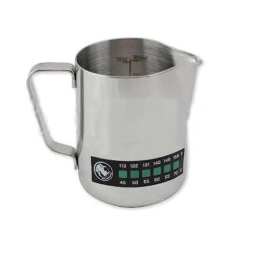 The Rhino Coffee Gear Professional Pitcher and Rhino Coffee Gear Accumtemp stick on thermometer offer the ideal solution for any barista wanting to take the guess work out of achieving the right temperature using the best milk pitcher on the market.